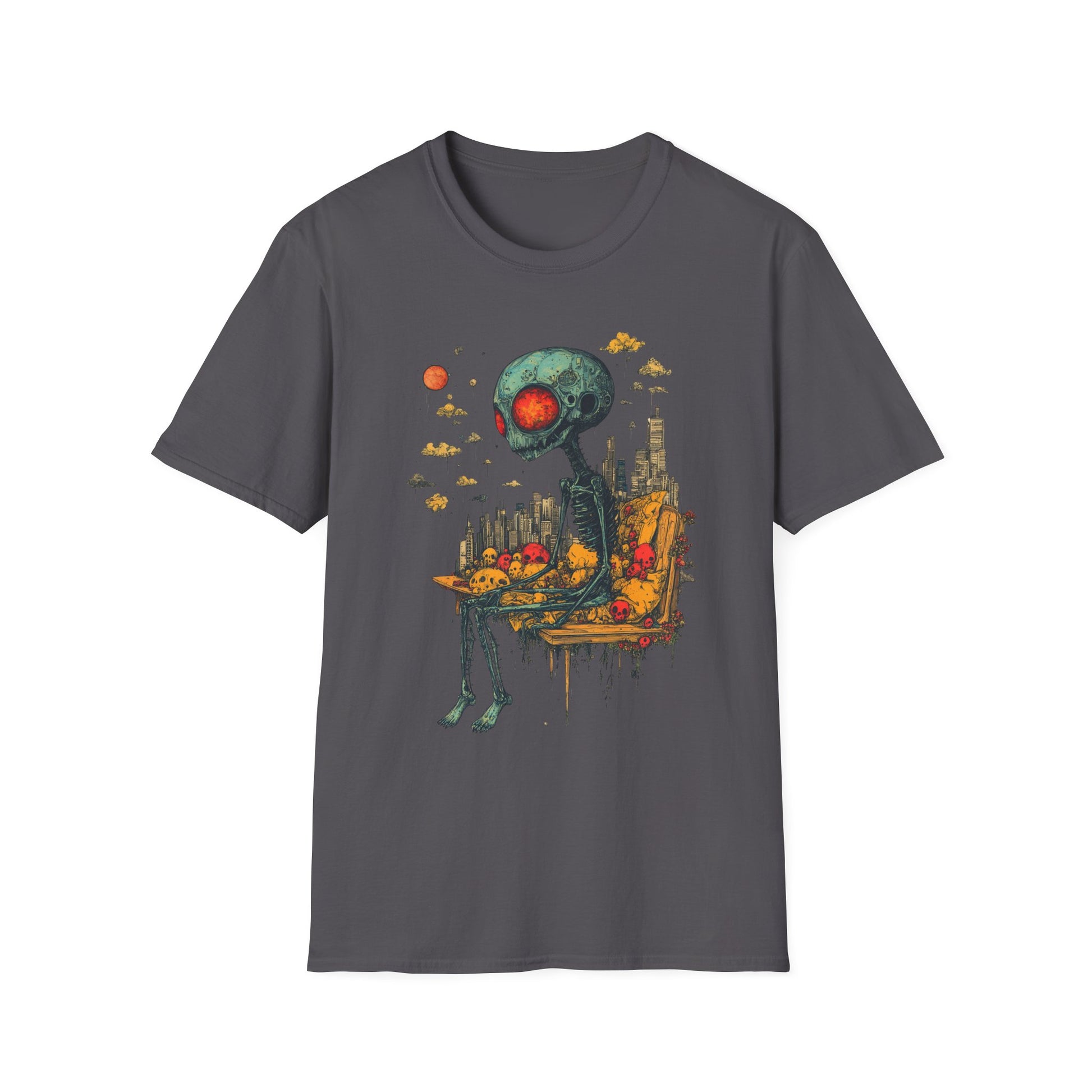 An emaciated extraterrestrial sits in silence, surrounded by melting skulls and a city that forgot its soul. This surreal scene blends cosmic horror with urban decay—like a dystopian postcard from a planet that never made it. Glowing red eyes. Dripping bench. Skyscrapers that watch but never speak. It’s not just a shirt—it’s a mood.