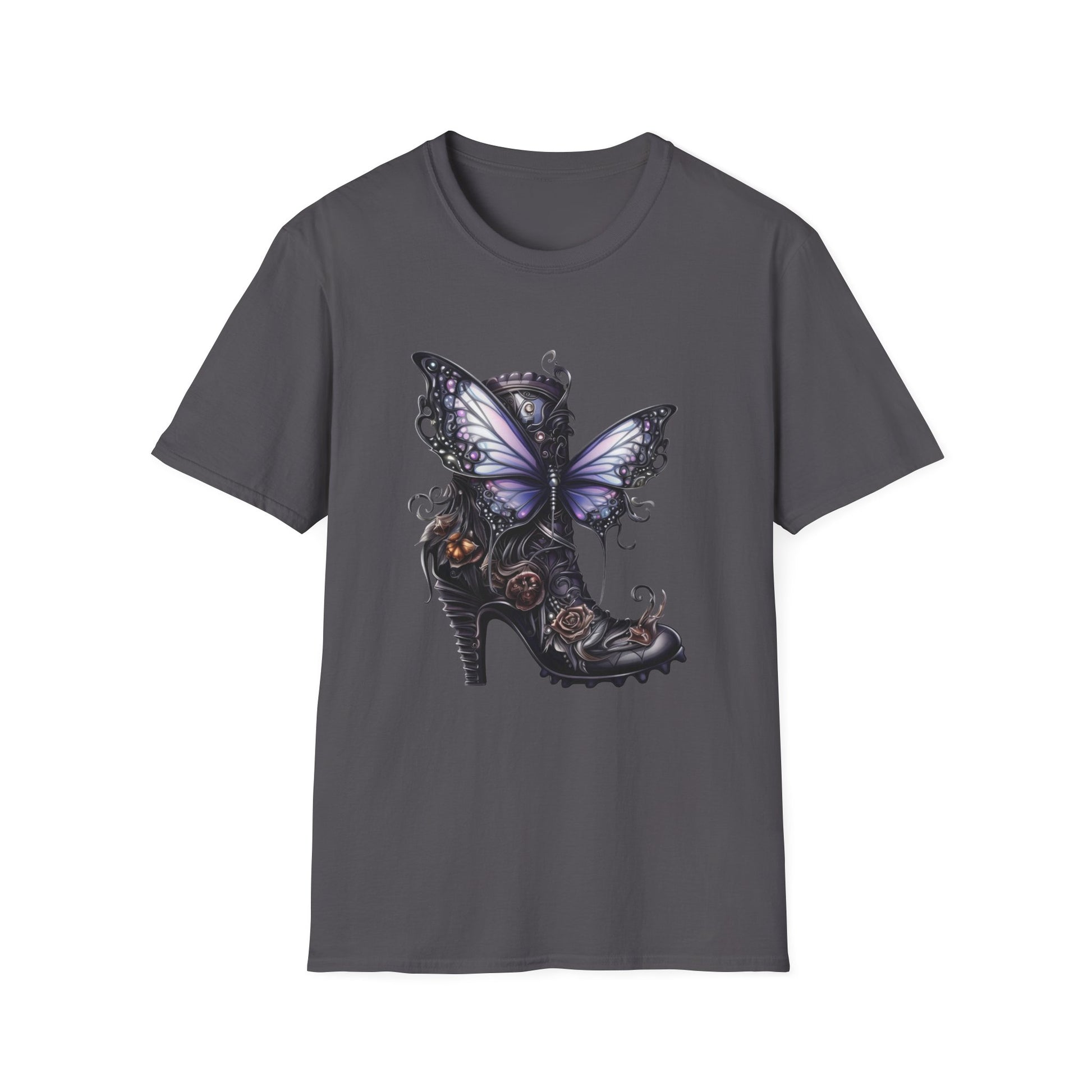 Step into the surreal. This “Butterfly Heel” tee features a striking high-heeled shoe with swirling black patterns, metallic floral accents, and dramatic butterfly wings in shades of purple, blue, and white. With a ridged heel and ethereal textures, this design fuses fashion and fantasy into a wearable work of art. Whether you’re gifting it or rocking it as a statement piece, this shirt is a tribute to bold beauty, whimsical rebellion, and the magic of stepping out in style.