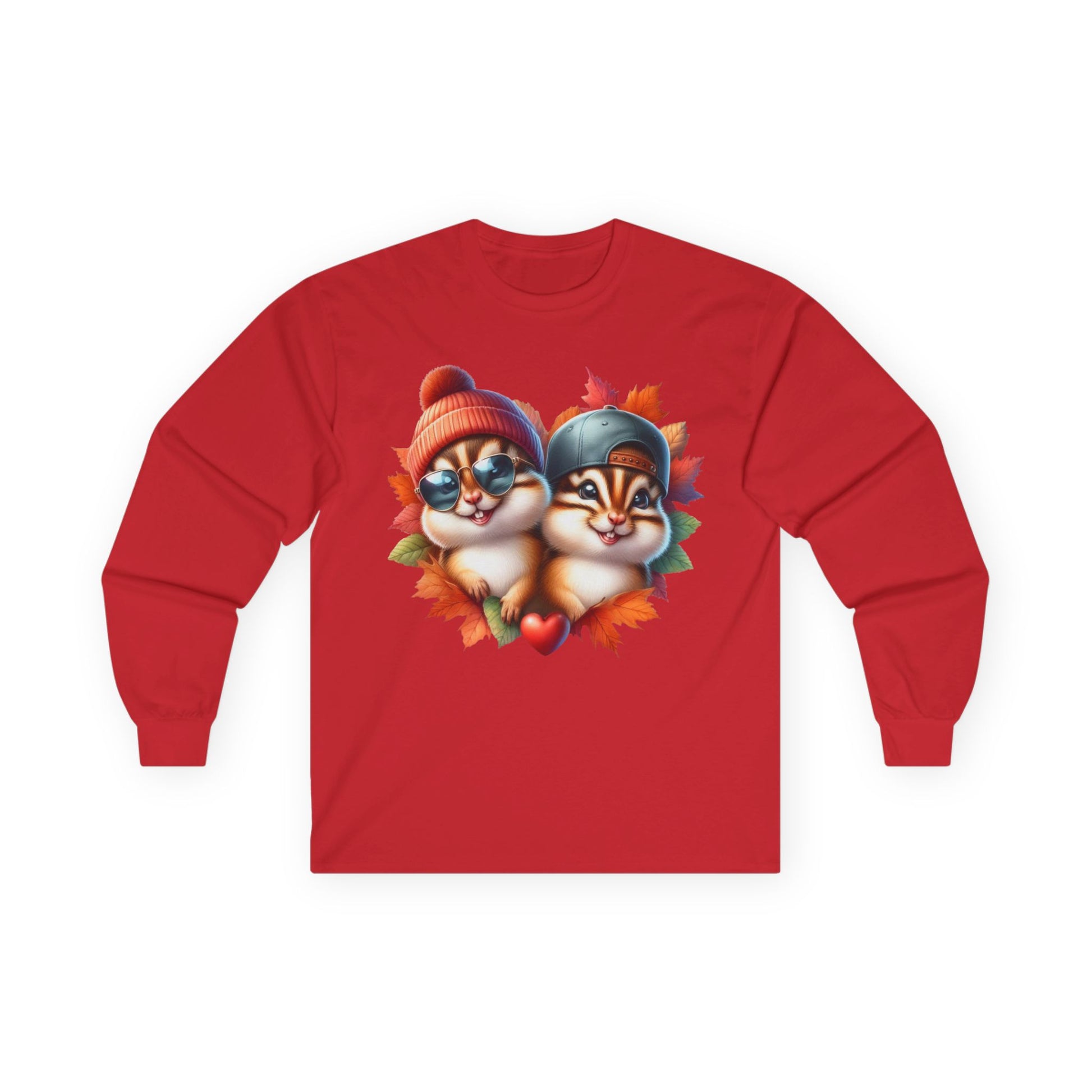 **LONG SLEEVE SHIRT** Introducing the perfect addition to your wardrobe, this Unisex Ultra Cotton Long Sleeve Tee embodies comfort and charm. This “Chipmunk Crew” tee features two cartoon-style chipmunks dressed for autumn fun—one rocking a red knit beanie and oversized sunglasses, the other sporting a backwards gray cap. Surrounded by swirling orange, red, and yellow leaves, and anchored by a bold red heart, this design radiates cozy vibes and bestie energy. Whether you’re gifting it or wearing it to your next cider run, this shirt is a celebration of fall, fun, and furry attitude.