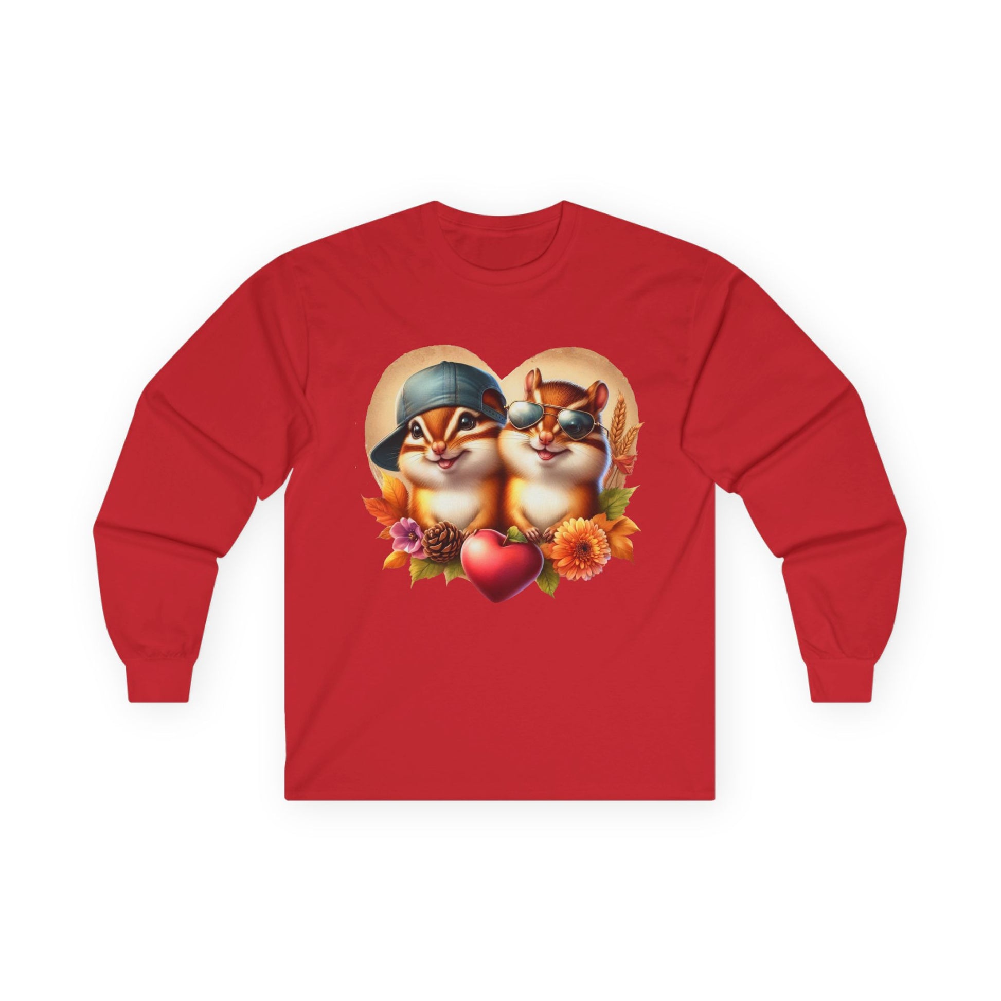 **LONG SLEEVE SHIRT** Introducing the perfect addition to your wardrobe, this Unisex Ultra Cotton Long Sleeve Tee embodies comfort and charm. This “Chipmunk Love” tee features two expressive chipmunks dressed for autumn fun—one rocking a sideways blue cap, the other sporting aviator shades. Surrounded by pinecones, wheat stalks, colorful leaves, and seasonal florals, they sit framed by a glowing heart and a bold red centerpiece that radiates warmth and friendship. Whether you’re gifting it or wearing it to your next bonfire or pumpkin patch stroll, this shirt is a cozy celebration of love, laughter, and woodland swagger.