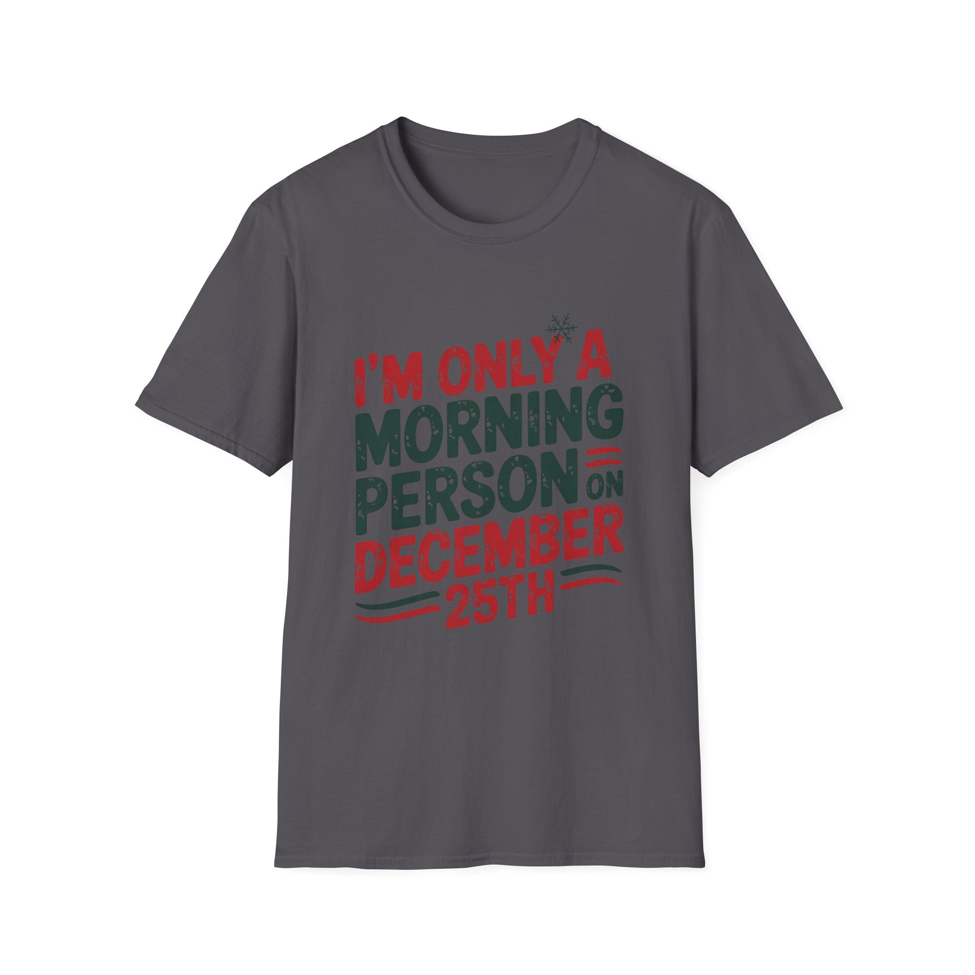 Let’s be honest—morning people are mythical creatures… unless it’s Christmas. This holiday-ready tee is for the sleep-loving souls who only leap out of bed when Santa’s been. With distressed red and green text, a snowflake dotting the “i,” and vintage vibes baked in, it’s the perfect shirt for festive grumps and joyful gift-grabbers alike.