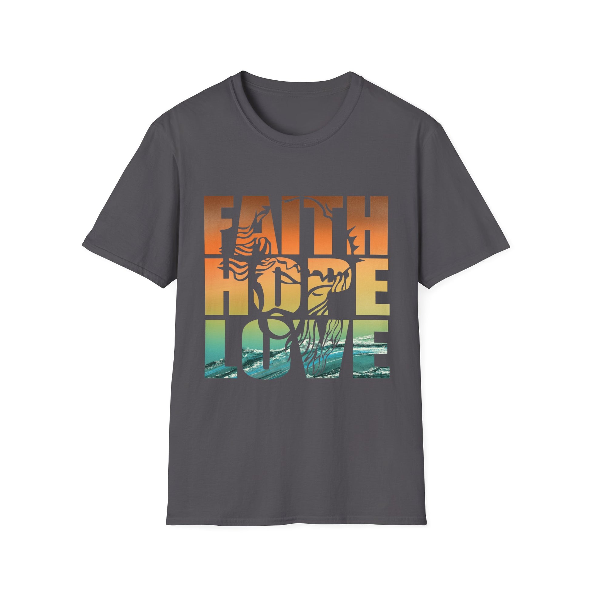 Faith that stands firm. Hope that endures. Love that leads. This “Faith Hope Love” tee weaves powerful words with the face of a lion—symbolizing courage, leadership, and divine authority. Set against a warm-to-cool gradient backdrop that evokes sunset over water, the design speaks to strength in every season. Whether you’re gifting it or wearing it as a daily declaration, this shirt is a visual anthem of spiritual resilience.