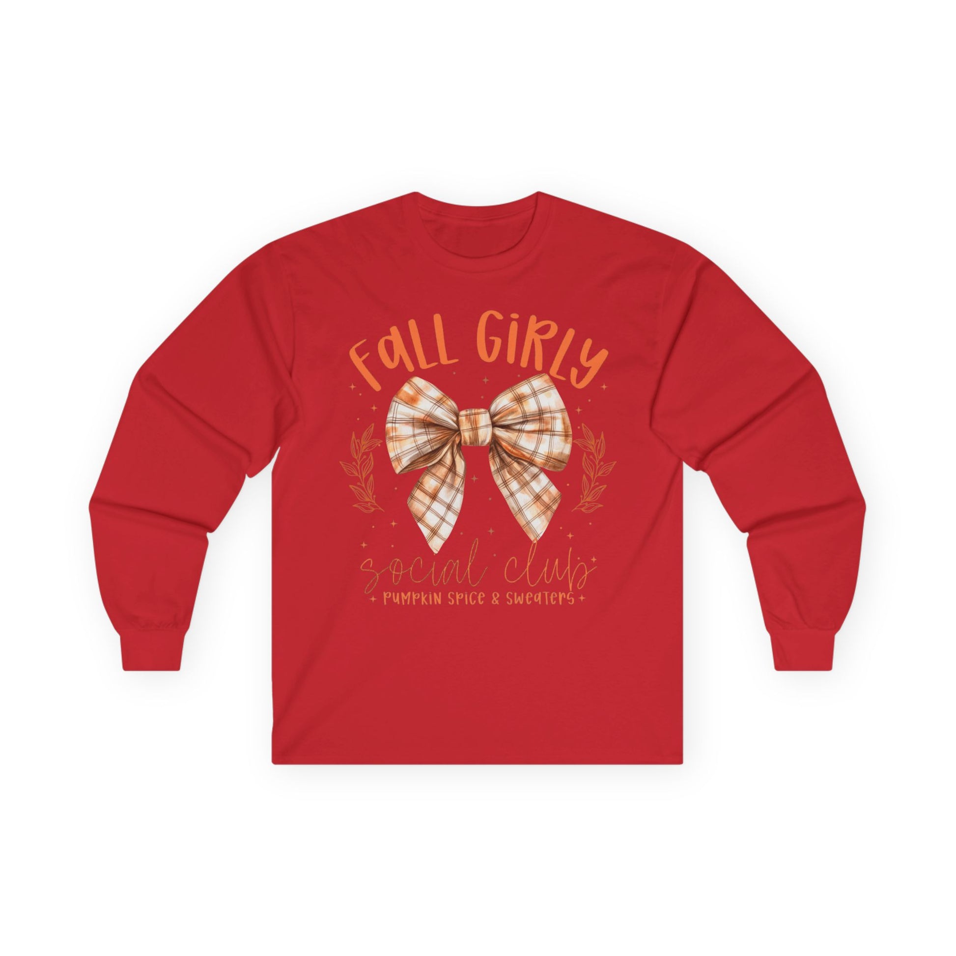 **LONG SLEEVE SHIRT** Introducing the perfect addition to your wardrobe, this Unisex Ultra Cotton Long Sleeve Tee embodies comfort and charm. This “Fall Girly Social Club” tee features a decorative design centered around a bold plaid bow in warm orange and cream tones, surrounded by leafy branches and star accents. The text reads: “FALL GIRLY social club – PUMPKIN SPICE & SWEATERS” It’s a cozy shoutout to the season’s unofficial squad—those who live for layered looks, cinnamon scents, and crisp-air confidence. Whether you’re gifting it or wearing it to your next cider run, this shirt is a badge of honor for autumn’s most stylish insiders.