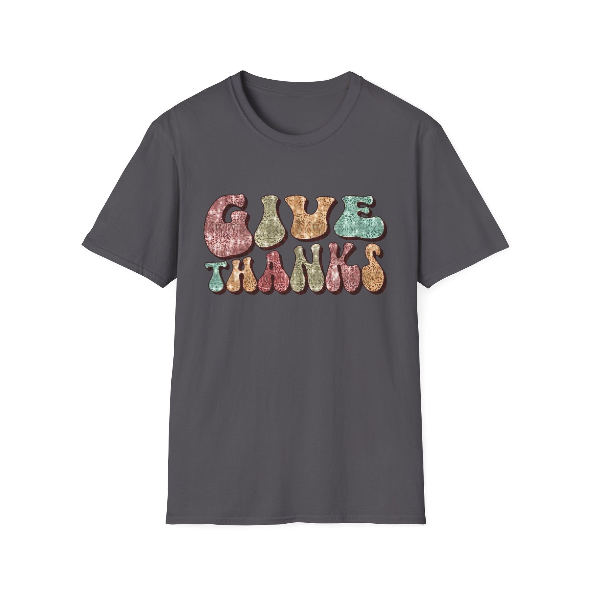 Gratitude never goes out of style—especially when it sparkles. This bold tee features retro bubble lettering filled with glittery textures in pink, green, gold, and blue, outlined in dark strokes for maximum pop. Whether you're hosting the feast, hitting a Friendsgiving, or just vibing with the season, this shirt brings the shine and the sentiment.