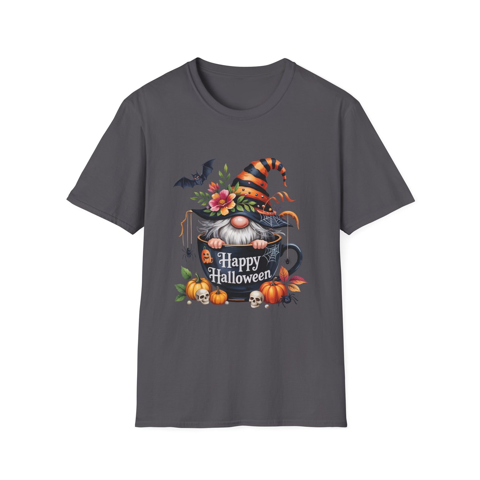 This T-Shirt features a Halloween gnome peeking out from a black cup labeled “Happy Halloween,” surrounded by bats, spiders, skulls, pumpkins, and autumn leaves. It brings a spooky yet charming vibe perfect for Halloween enthusiasts and those who love cozy chaos. Whether you're trick-or-treating or just vibing with the season, this shirt is a must-have for the Halloween celebration.