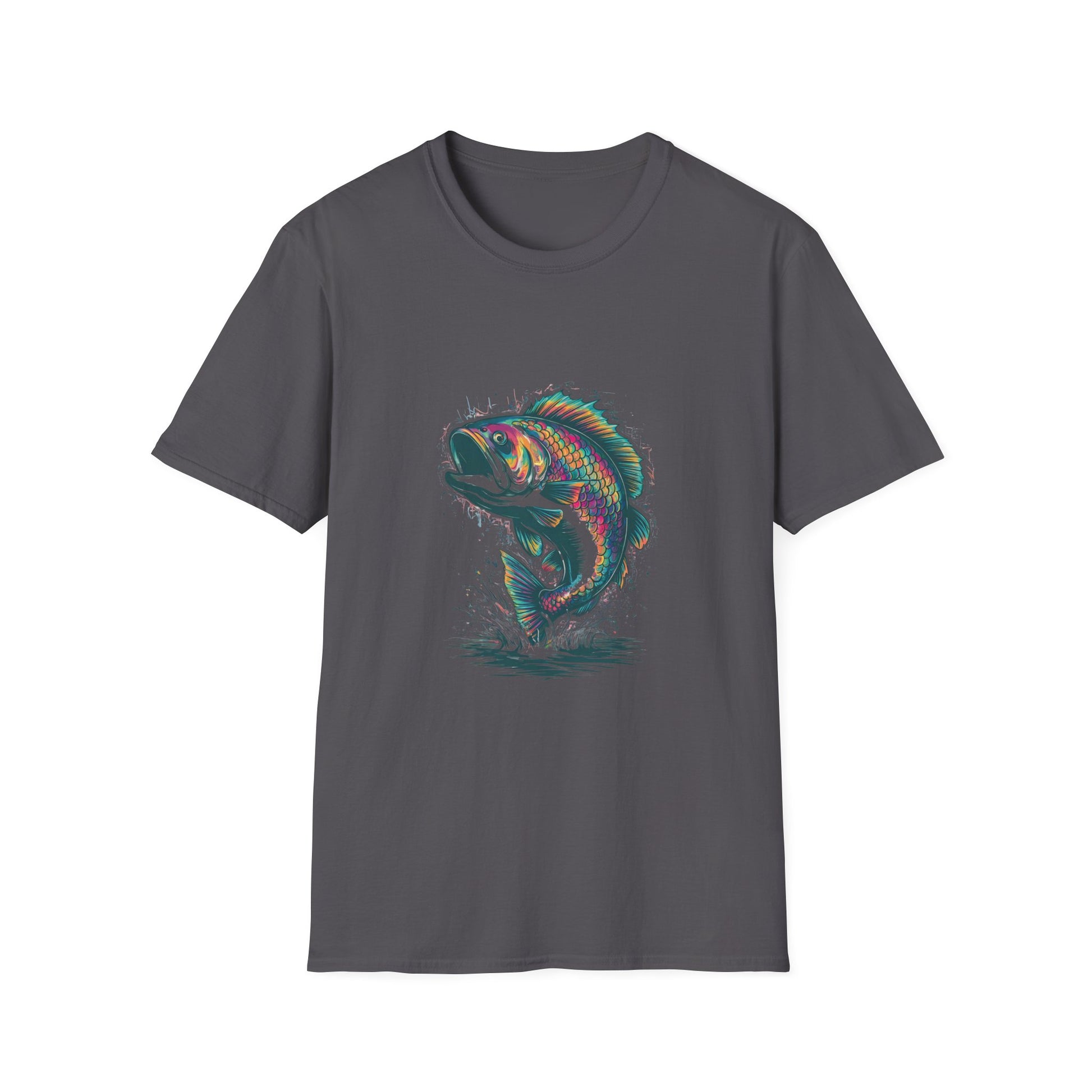 Make waves with the "Hooked on Color" Bass Splash Tee — a vibrant tribute to the thrill of the catch and the art of the wild. This electrifying design features a bass mid-leap, bursting from the water in a riot of rainbow scales and kinetic splash. Every fin and ripple is illustrated with painterly precision, turning this freshwater legend into a wearable masterpiece.