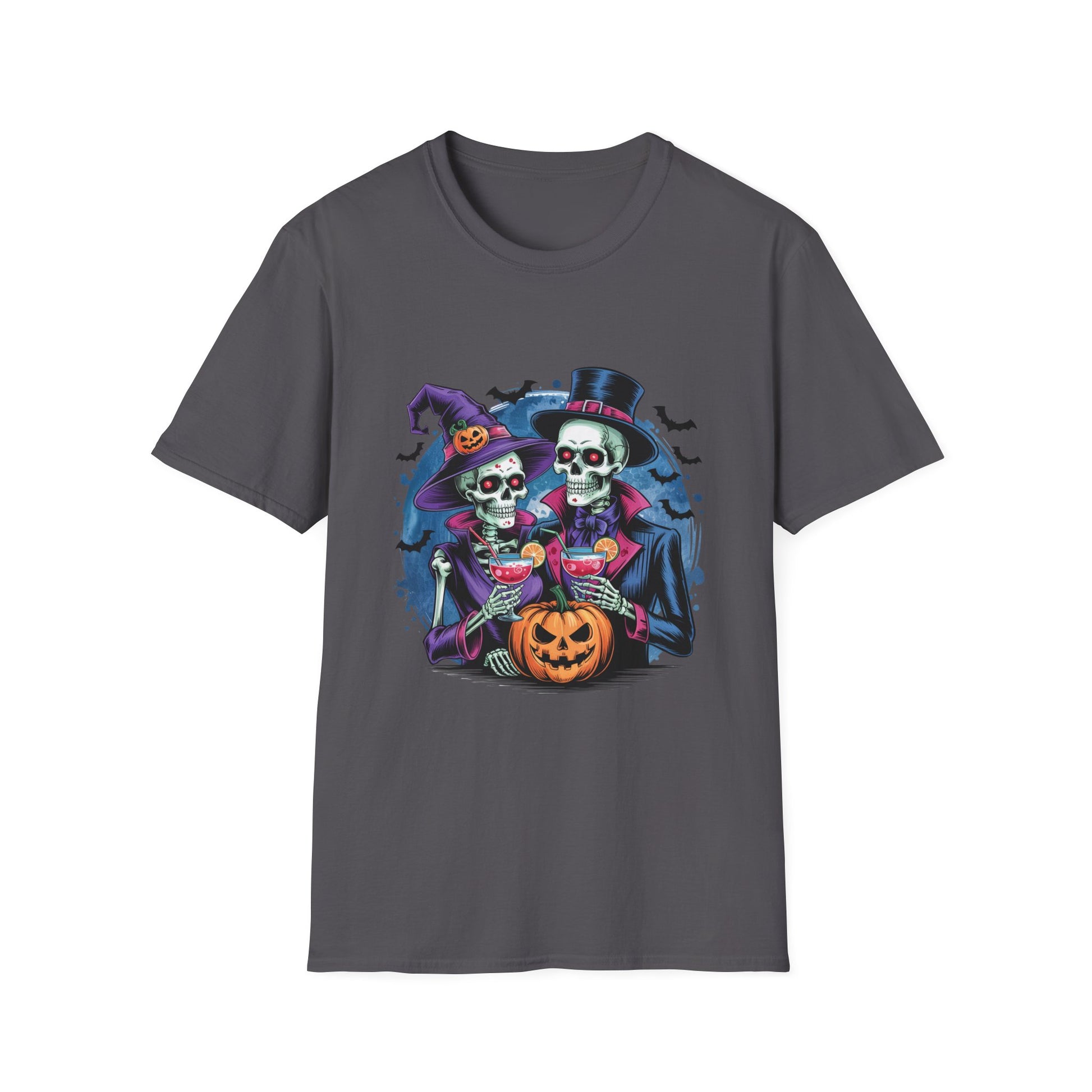This tee is dressed to kill. A skeleton duo—one in a witchy purple dress and hat, the other in a dapper suit and top hat—raise their cocktail glasses under a full moon, flanked by bats and a sinister jack-o'-lantern. It’s part haunted romance, part spooky soirée. Whether you're trick-or-treating or just treating your wardrobe to some undead elegance, this shirt brings the boo with bubbles.