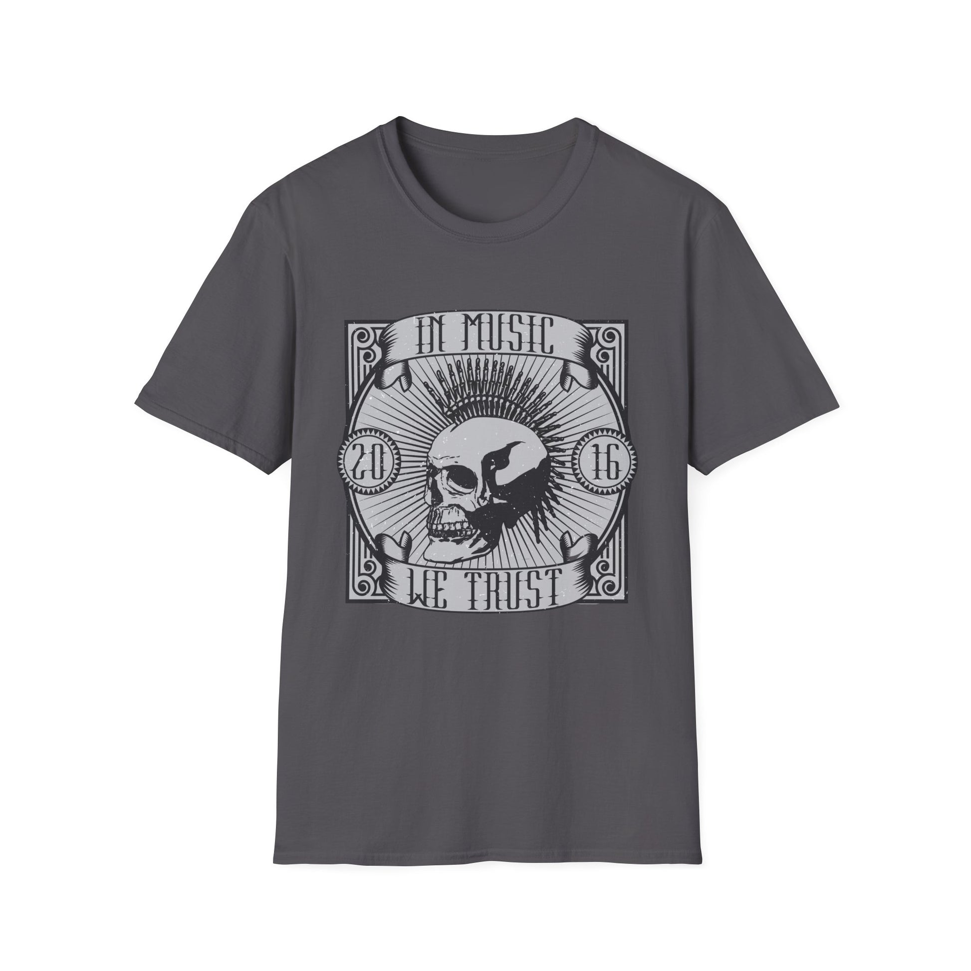 In Music We Trust—because when the world gets loud, music gets louder. This design features a skull with a mohawk made of bullets, radiating red energy lines and framed by ornate gothic borders. The circular layout and vintage textures channel underground grit and counterculture pride, while the bold emblems marked “20” and “16” nod to legacy and loyalty. It’s a visual creed for those who find truth in distortion and salvation in sound.