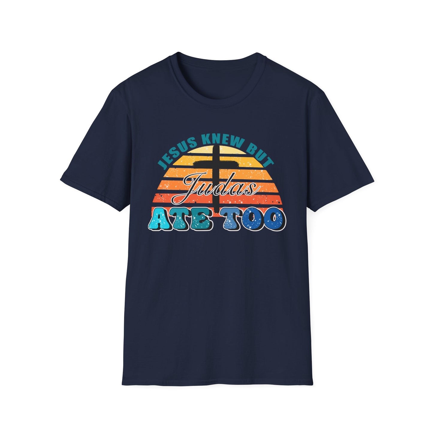 Forgiveness isn’t weakness—it’s divine strength. This “Jesus Knew But Judas Ate Too” tee delivers a powerful message: grace doesn’t exclude, even when betrayal is known. Featuring distressed blue typography, elegant white script, and a sunset-striped background with a central cross, this design is a visual sermon. Whether you’re wearing it to spark dialogue or simply to remind yourself of radical love, this shirt invites reflection and bold witness.