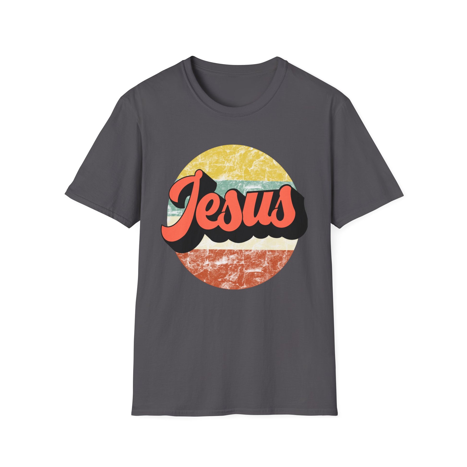 Faith meets funk. This “Jesus” tee turns a timeless name into a vibrant visual anthem. With bold cursive lettering in fiery orange-red, backed by a distressed sunset circle of yellow, green, white, and rust tones, it’s a throwback to vintage design with a splash of modern edge. Pink and black paint splashes add movement and energy, making this shirt perfect for believers who worship loud, live bold, and love colorfully.