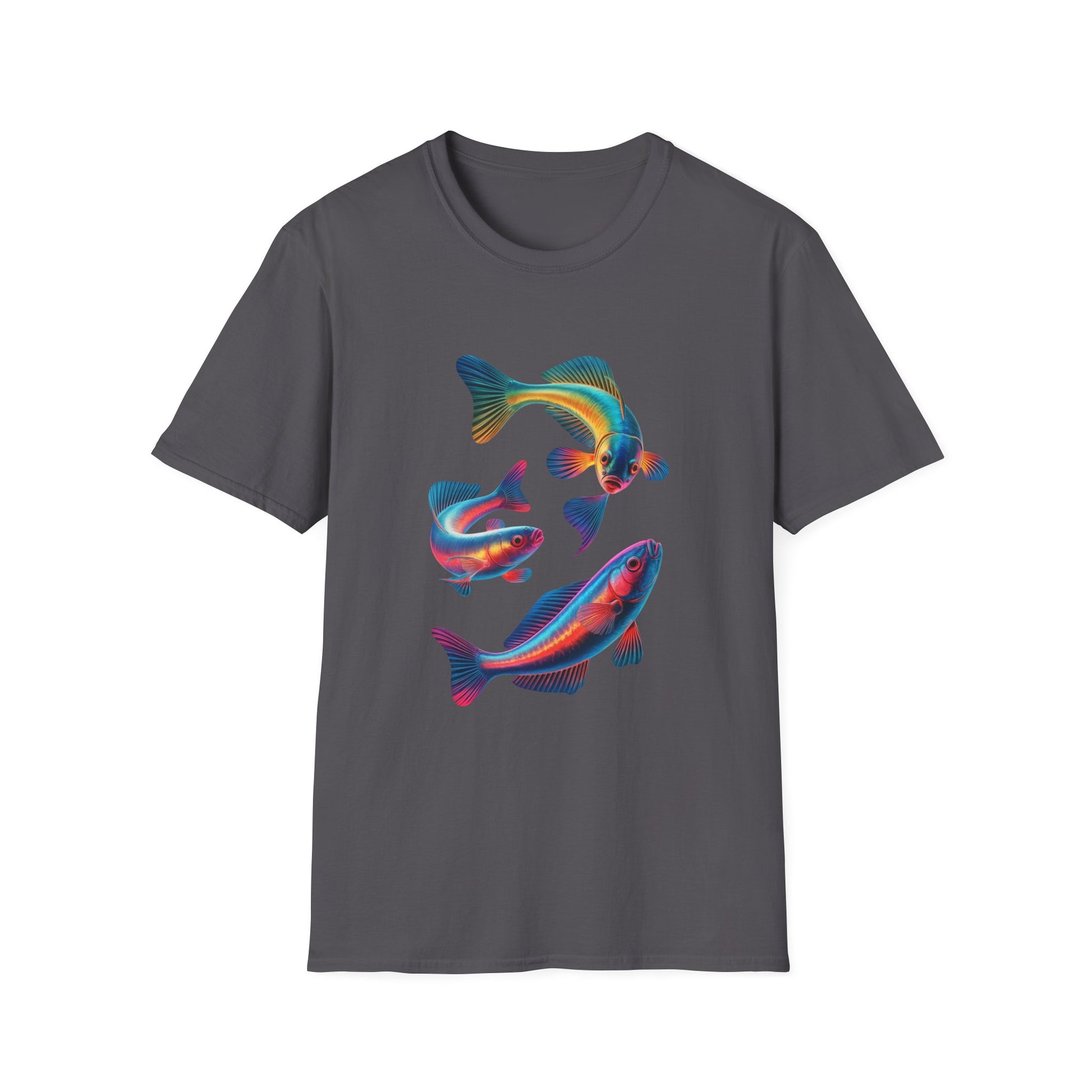 Dive into the deep end of style with the "Neon Current" Trio Fish Tee — a mesmerizing swirl of aquatic motion and electric color. Featuring three brilliantly illustrated fish in radiant shades of blue, pink, orange, and yellow, this design glows like bioluminescence against a sleek black backdrop. Each fish is rendered with flowing fins and iridescent scales, creating a hypnotic dance of light and movement.
