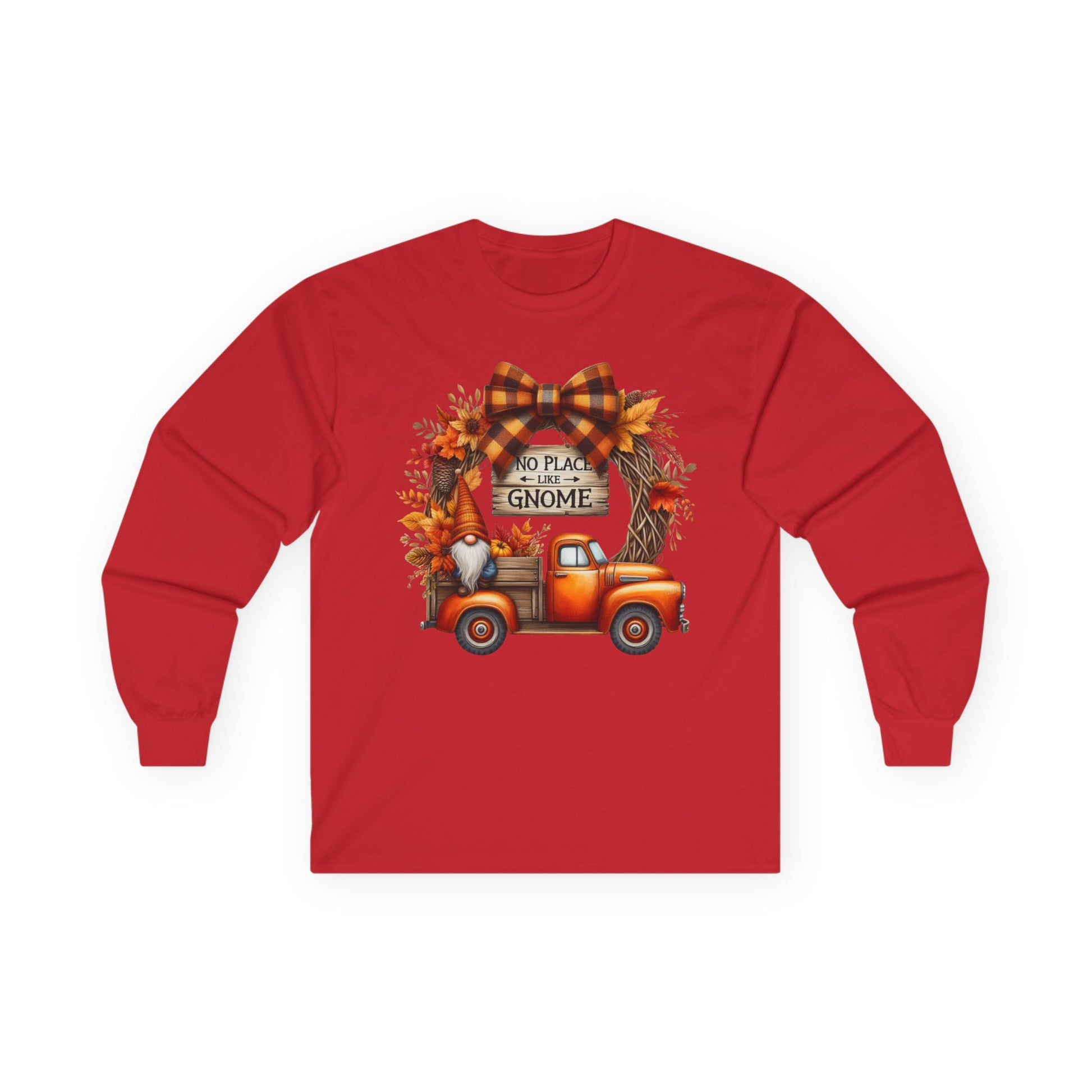 **LONG SLEEVE SHIRT** Introducing the perfect addition to your wardrobe, this Unisex Ultra Cotton Long Sleeve Tee embodies comfort and charm. This “No Place Like Gnome” tee features a vintage orange pickup truck hauling a cheerful gnome with a striped hat and flowing white beard, surrounded by fall foliage, pinecones, and warm-toned florals. Above the truck, a rustic wreath of intertwined branches and autumn leaves frames a wooden sign with the heartwarming phrase. Topped with a bold plaid bow, this design is a cozy celebration of fall, friendship, and front-porch charm—perfect for pumpkin patch strolls, Thanksgiving gatherings, or just living your best flannel life.