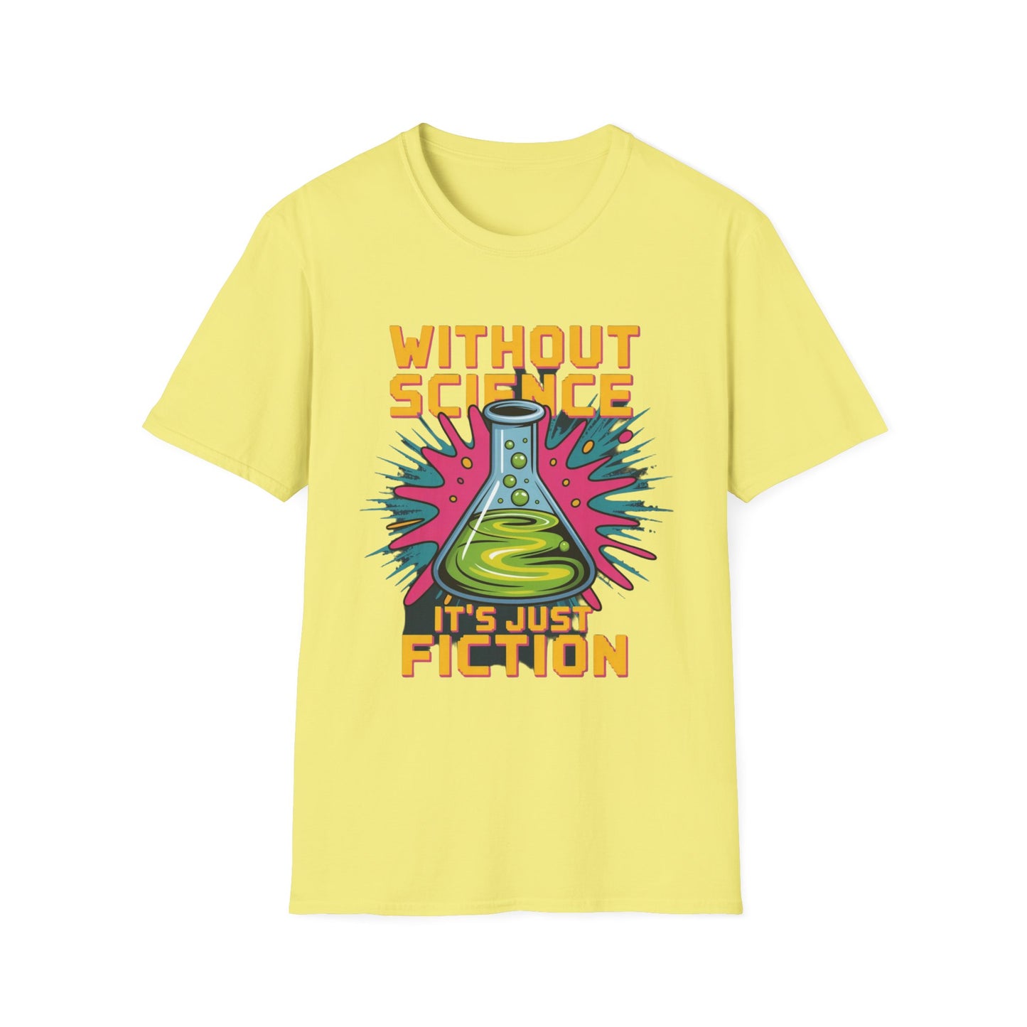 In a world full of wild theories and wishful thinking, this tee keeps it real—with a splash of neon and a flask full of truth. Featuring a bubbling green lab flask against a comic-style burst of pink and blue, and bold typography that says it loud: WITHOUT SCIENCE, IT’S JUST FICTION.