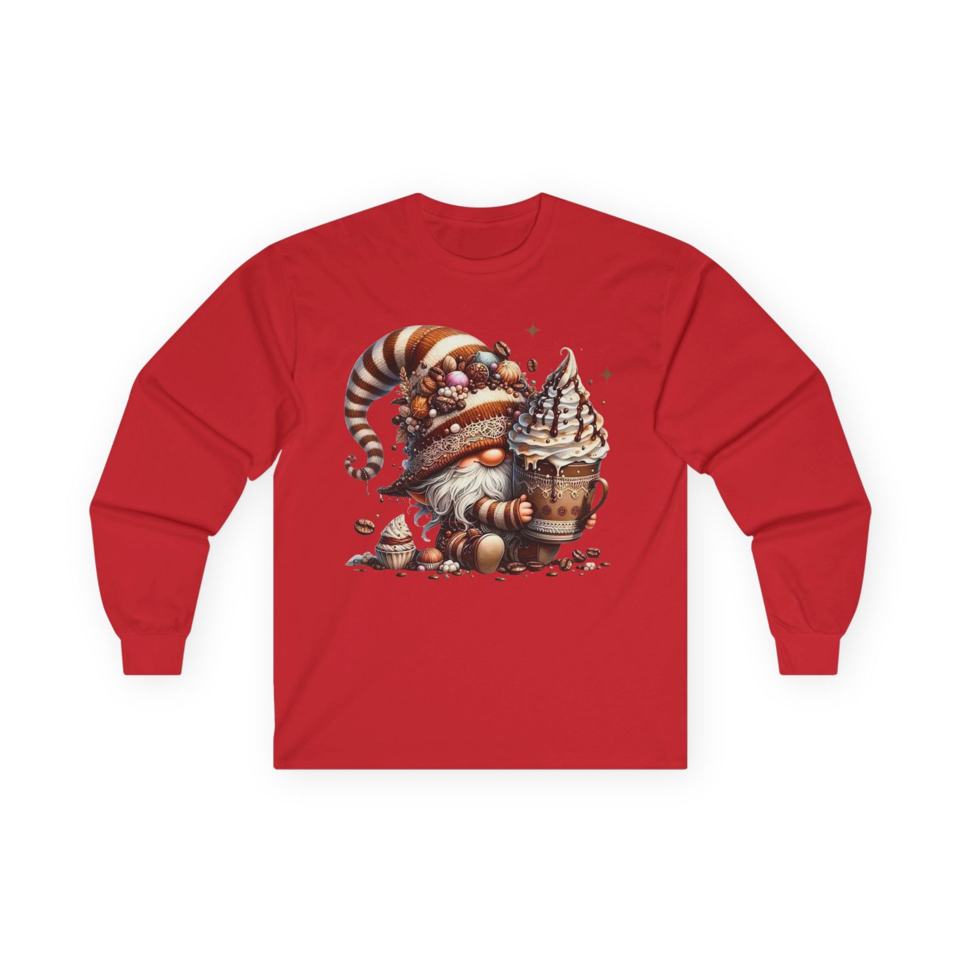 **LONG SLEEVE SHIRT** Introducing the perfect addition to your wardrobe, this Unisex Ultra Cotton Long Sleeve Tee embodies comfort and charm. This “Sweet Brew Gnome” tee features a whimsical character with a flowing white beard and a towering striped hat topped with macarons, candies, and whipped cream. Cradling an oversized mug overflowing with chocolate drizzle and sprinkles, he’s surrounded by coffee beans, cupcakes, and cozy vibes. With warm browns, soft pinks, and creamy tones, this design is a wearable treat for anyone who loves their fantasy with a side of sugar.