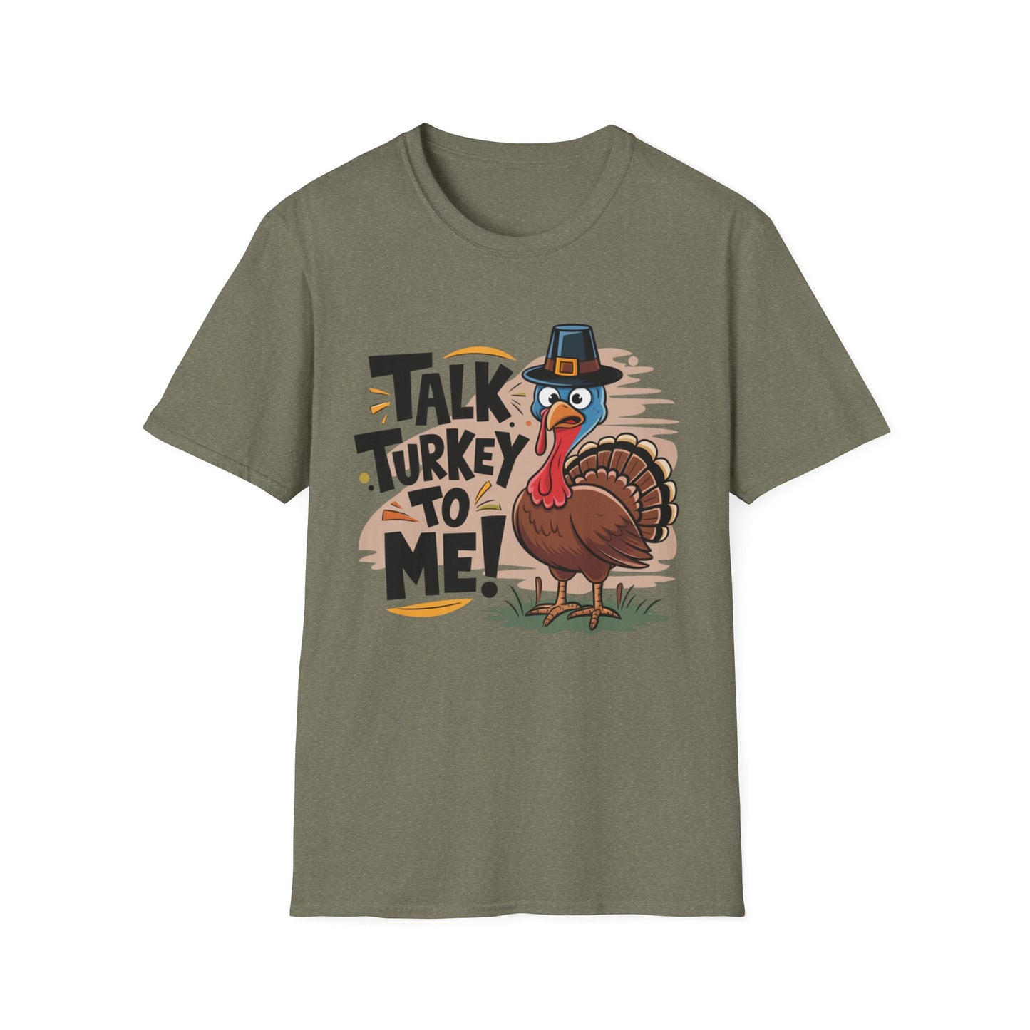 This turkey’s got something to say—and it’s not just gobble-gobble. Featuring a cartoon turkey with expressive eyes, colorful feathers, and a classic pilgrim hat, this tee delivers the cheeky phrase “Talk Turkey to Me!” in bold, decorative fonts. It’s a playful twist on a classic idiom, perfect for anyone who brings sass and stuffing to the table.