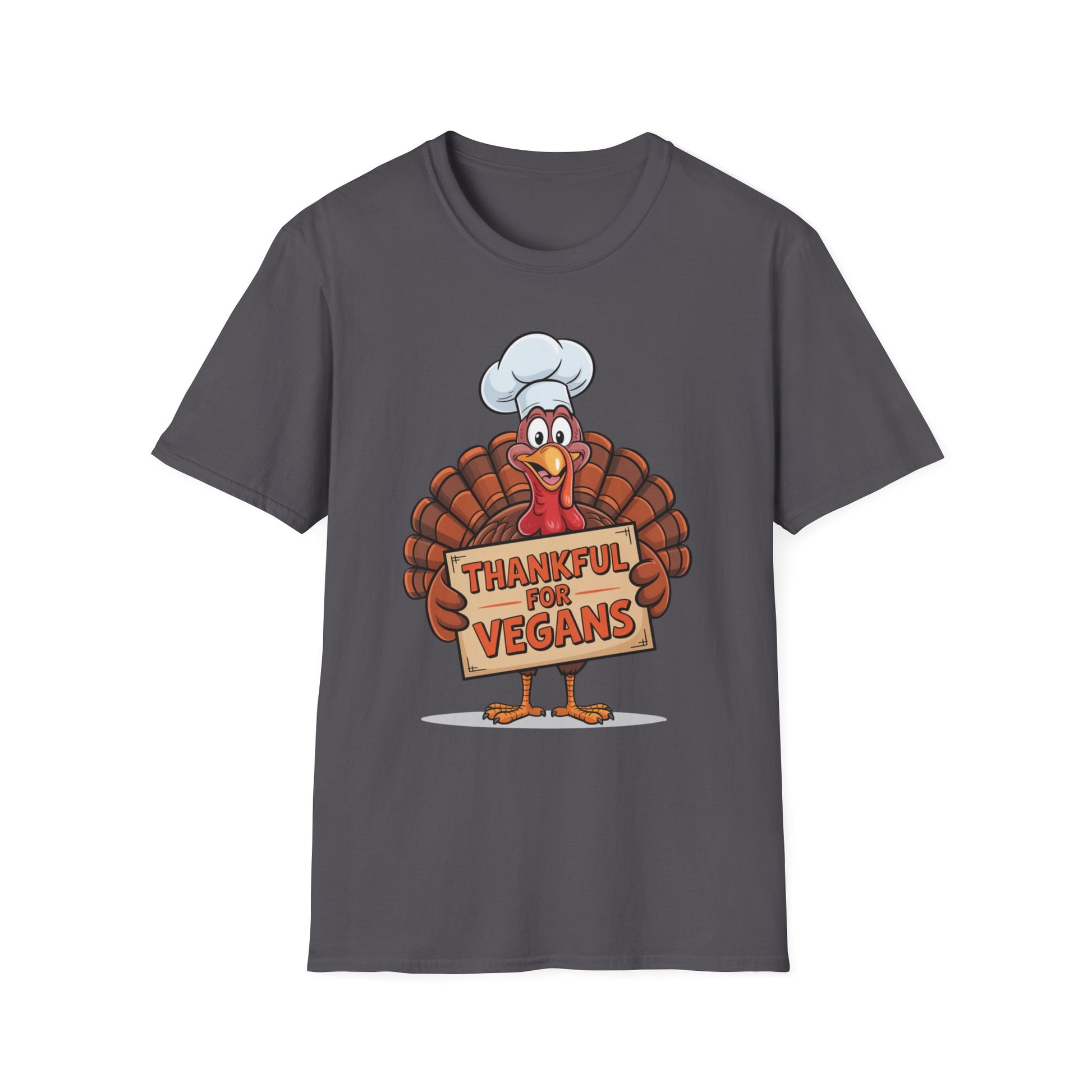 Finally, a turkey with something to be truly thankful for. This hilarious tee features a cheerful cartoon turkey in a chef’s hat holding a sign that reads “Thankful for Vegans.” With bright feathers and a bold message, this design flips the Thanksgiving narrative with playful charm and a wink to plant-based peacekeepers. Whether you're vegan, veg-curious, or just love a good laugh, this shirt brings humor and compassion to the holiday table.
