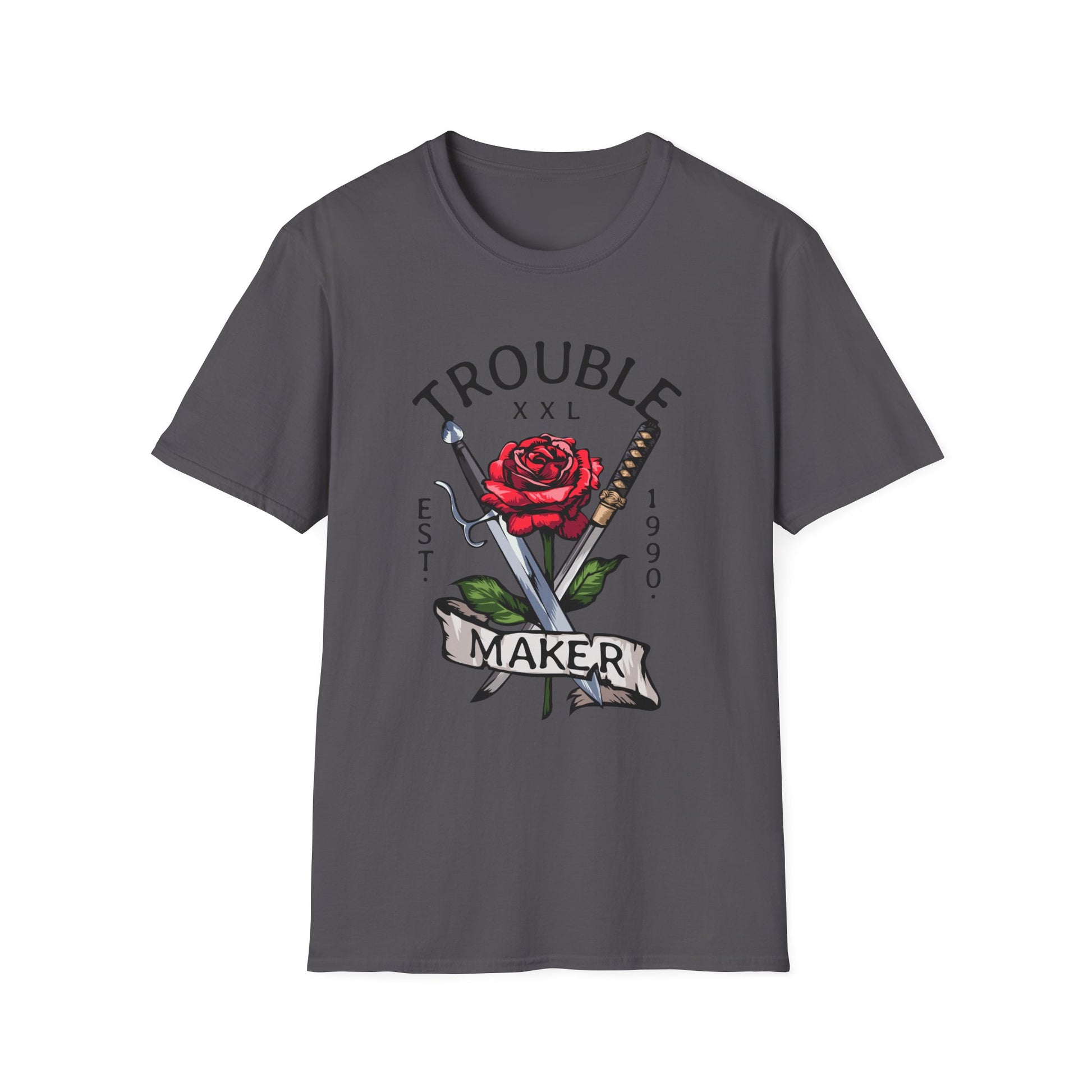 A fierce red rose crossed by two swords—classic and katana—frame the word “TROUBLE MAKER” in a banner daring you to challenge the status quo. This edgy design is a tribute to the misfits, makers, and defiant souls who create chaos with intention and style. Perfect for those who embrace their individuality and enjoy making a statement. Ideal for rebels, troublemakers, and those who march to the beat of their own drum. Great for casual wear or as a statement piece for rebellious occasions and celebrations.