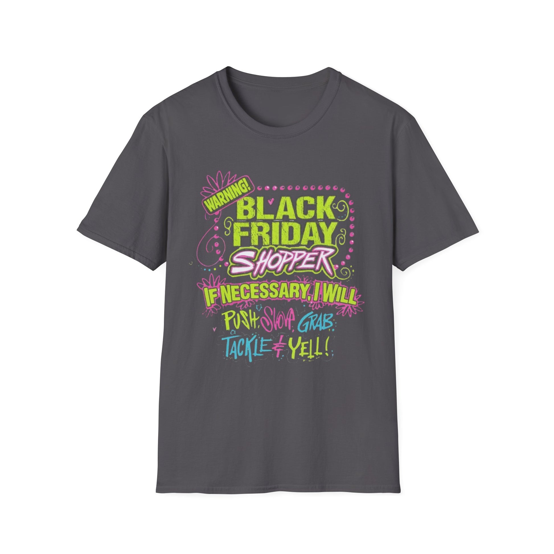 Brace yourselves—she’s caffeinated, coupon-loaded, and ready to tackle. This loud and proud tee features vibrant fonts, wild colors, and a hilarious declaration of Black Friday battle-readiness: “If necessary, I will push, shove, grab, tackle & yell!” With stars, swirls, and floral chaos, it’s the perfect uniform for anyone who treats doorbusters like a contact sport. Whether you're first in line or just there for the drama, this shirt makes your intentions crystal clear.