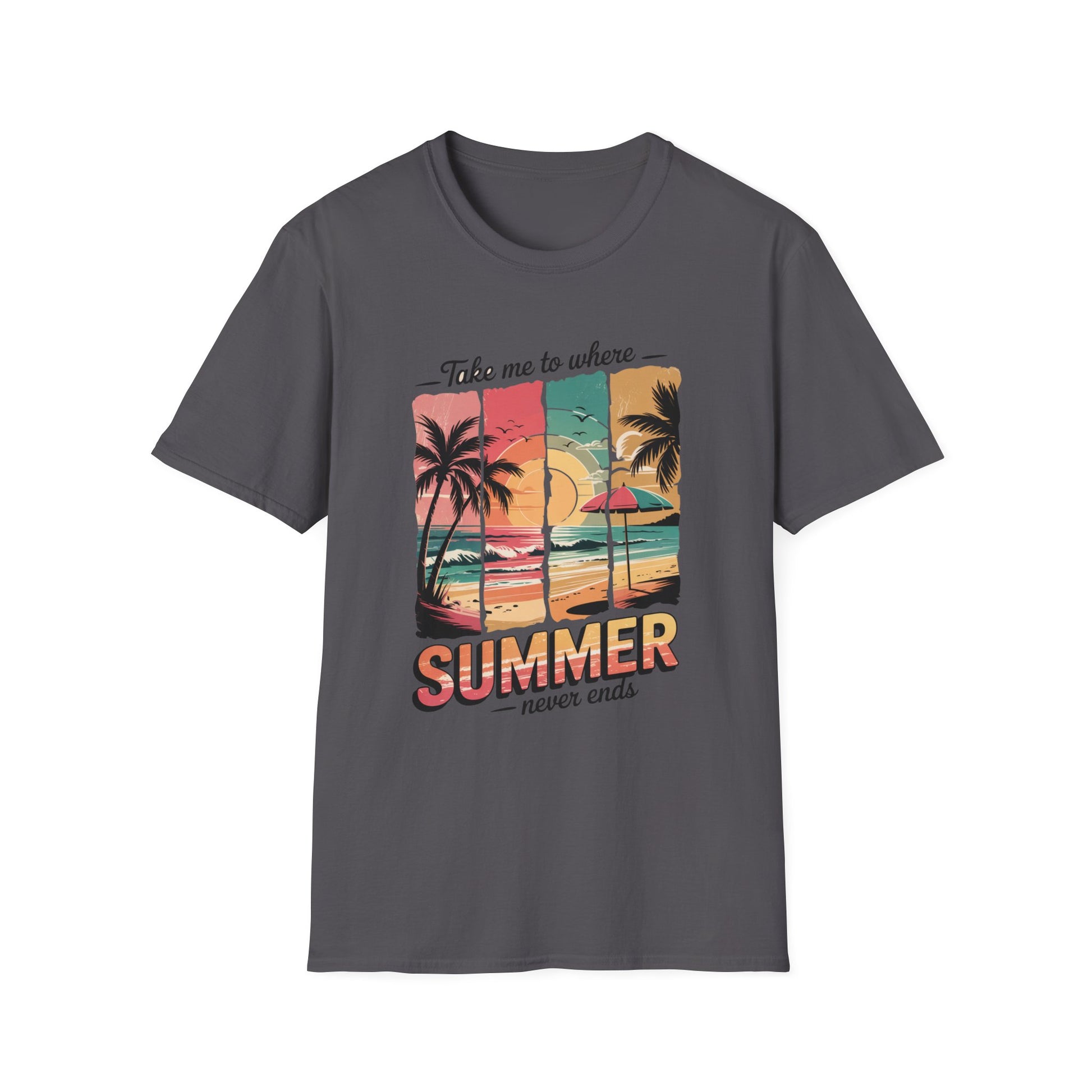 Escape to endless sunshine with the "Where Summer Never Ends" Tee — a dreamy beachscape split into five vibrant panels, each capturing a slice of paradise. From swaying palms and soaring birds to ocean waves and umbrella shade, this design radiates the golden glow of sunset and the carefree spirit of vacation. With the phrase “Take me to where SUMMER never ends,” it’s a wearable postcard from your favorite season.