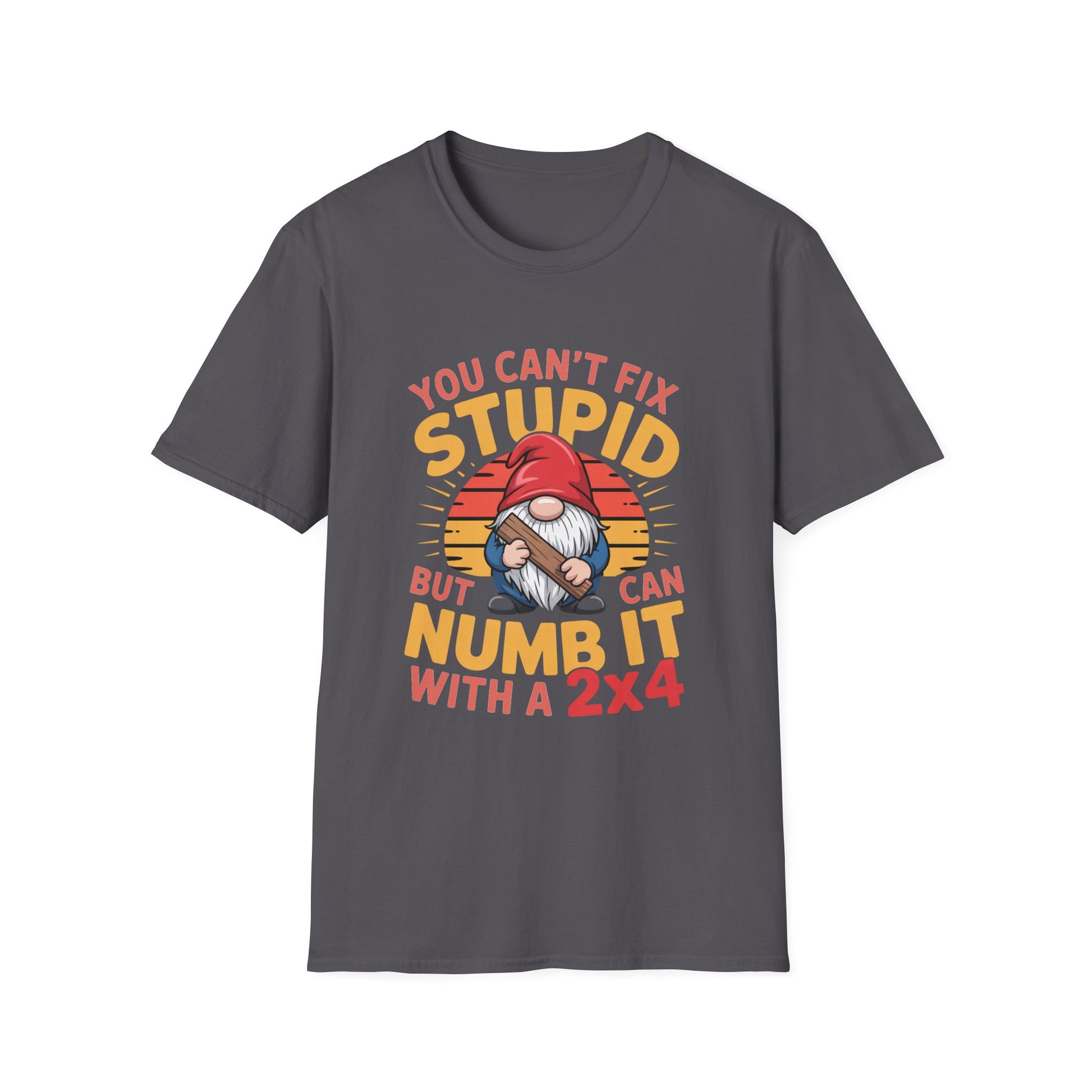 Some problems require lumber. This tee delivers a hilarious dose of sarcasm with a cartoon gnome who’s clearly had enough. Armed with a 2x4 and backed by a retro sunset, he’s here to remind the world: you can’t fix stupid, but you can numb it. Perfect for folks who love dry humor, backyard wisdom, or just a good visual punchline.